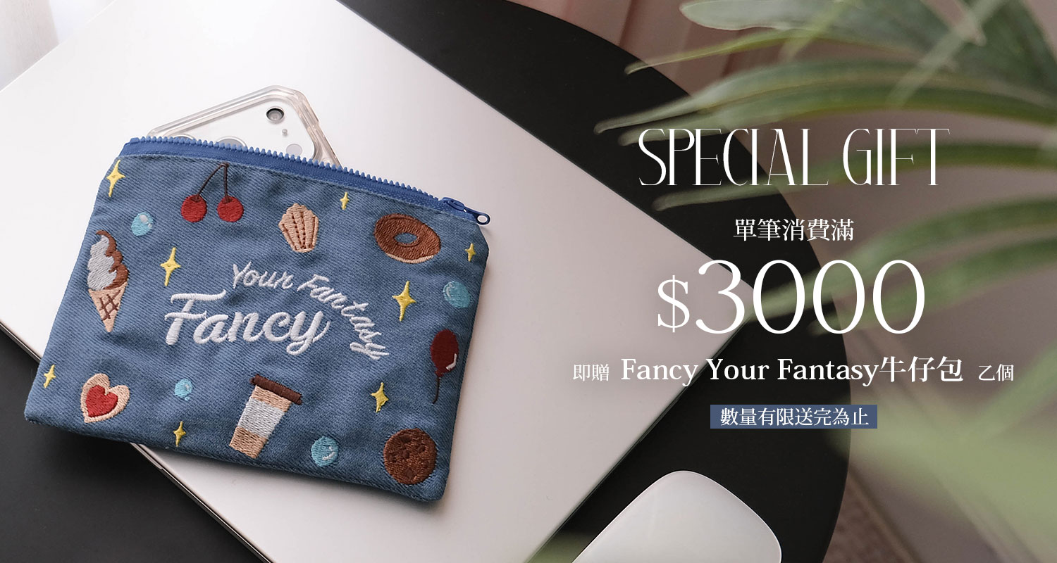 FancyMade滿額禮! 活動期間➲ ♦2026.03.01(日)18:00起 贈送方式➲ 凡單筆訂單結帳滿NT$3000(含)即可獲得Fancy Your Fantasy牛仔包乙個,無提供累加贈送。 活動名額➲ 數量有限,送完為止。 活動注意事項➲ 1. 如鑑賞期間有退貨產生,累積金額未達活動門檻,將自動取消滿額贈品。 2. 單筆訂單以實際結帳金額為準,不含運費及折價券金額。 3. 贈送資格將以最終結帳金額為主,該筆交易未取消、無整筆退貨退款或無其他爭議者,即可視為訂單成立,並符合贈送資格。 4. 為保護雙方權益,FancyMade不任意更改活動辦法,但保留修改活動內容之權利。 5. 如有任何問題,歡迎與FancyMade客服聯繫。